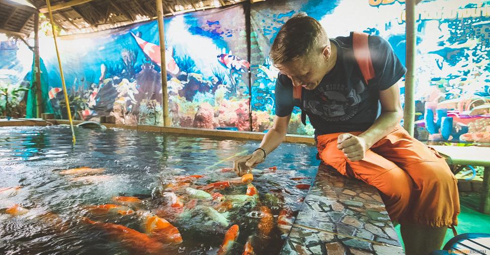 Красивая ухоженная территория с прудами, цветниками, садами и галереей бойцовых рыб. Очень приятное местечко.
