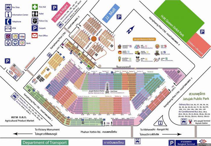 Эти улочки сгруппированы в секции, всего насчитывается 27 секций. Вы обнаружите более чем одну категорию товаров, содержащихся в одной секции, и та же категория товаров снова появятся в других секциях. С точки зрения размещения вашей категории товаров, эта система в общем то бесполезна, но она хорошо пригодится, когда вы пытаетесь найти своё точное местонахождение на карте Чатучак.